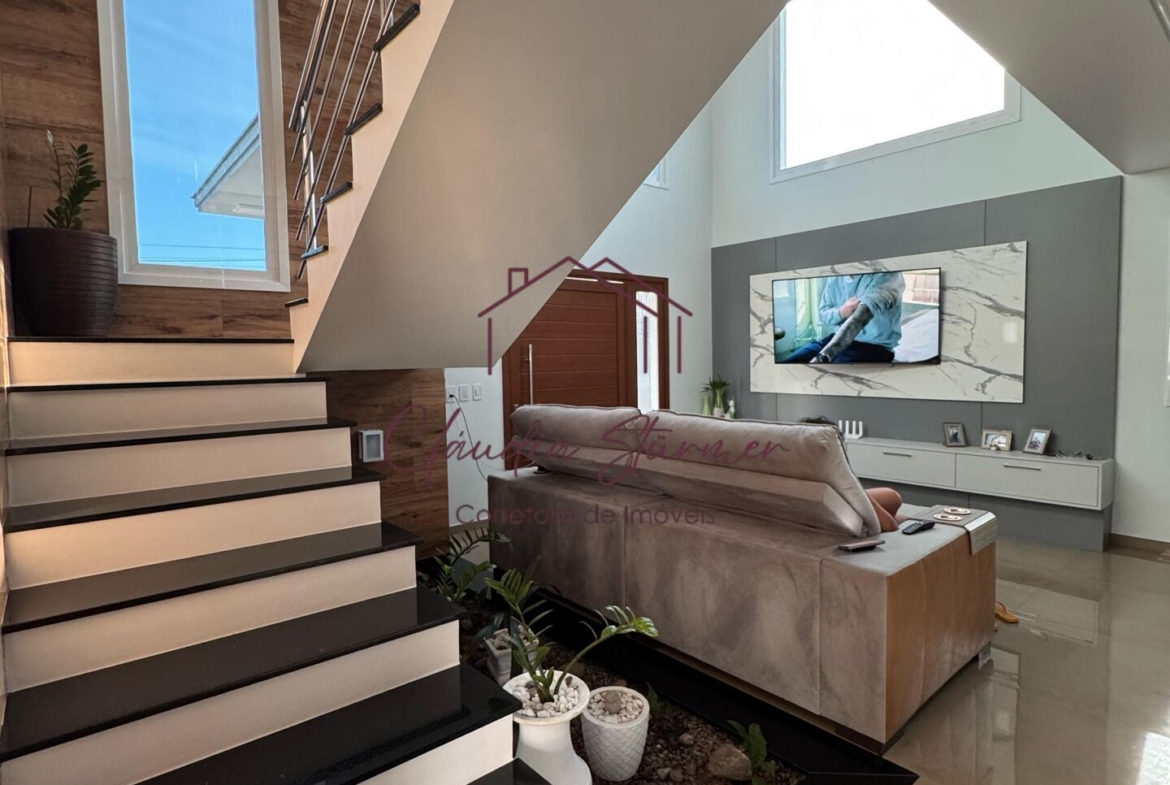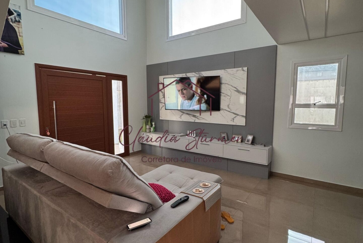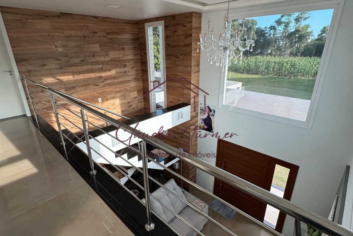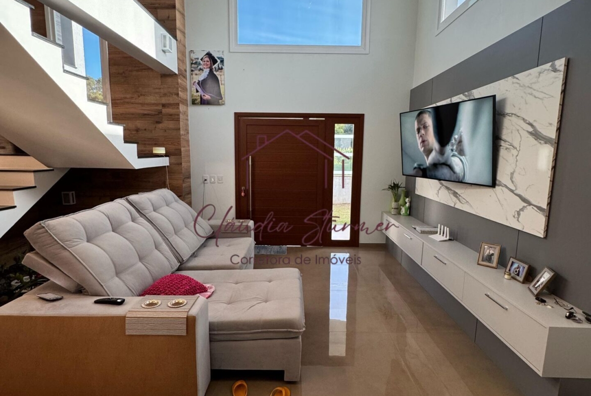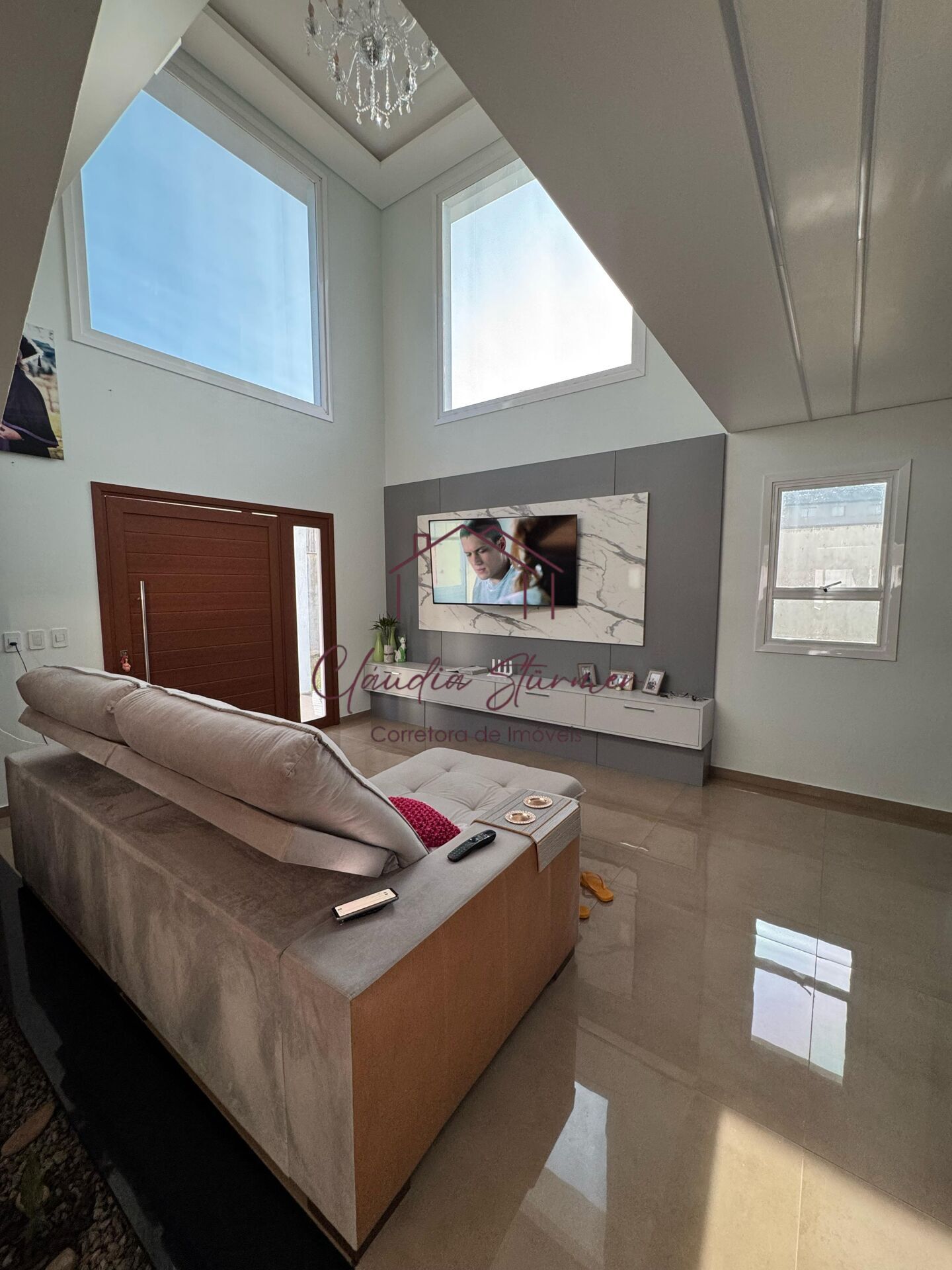 A casa conta com pé-direito alto, proporcionando imponência e sofisticação à sala de estar, valorizada por um belíssimo lustre e amplas janelas de vidro que garantem excelente iluminação natural e uma vista encantadora.