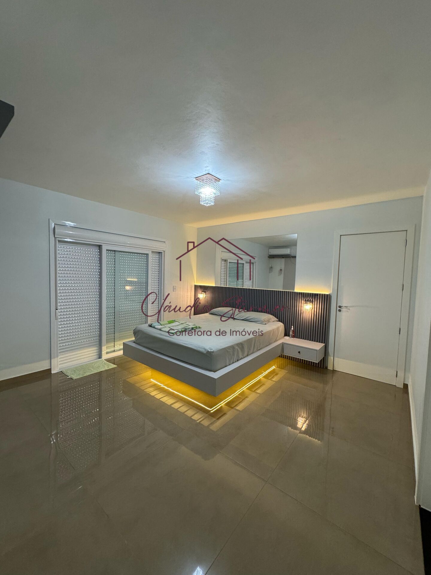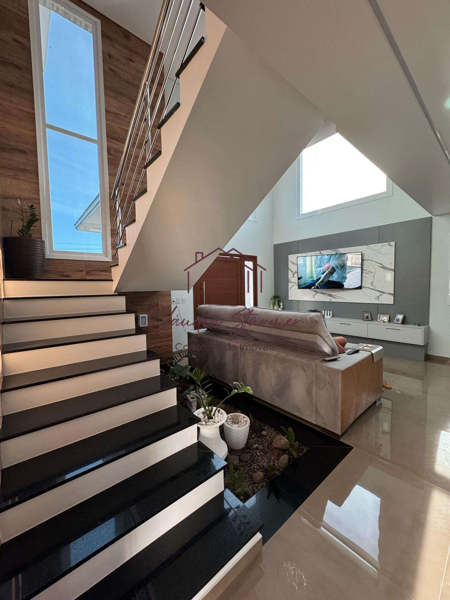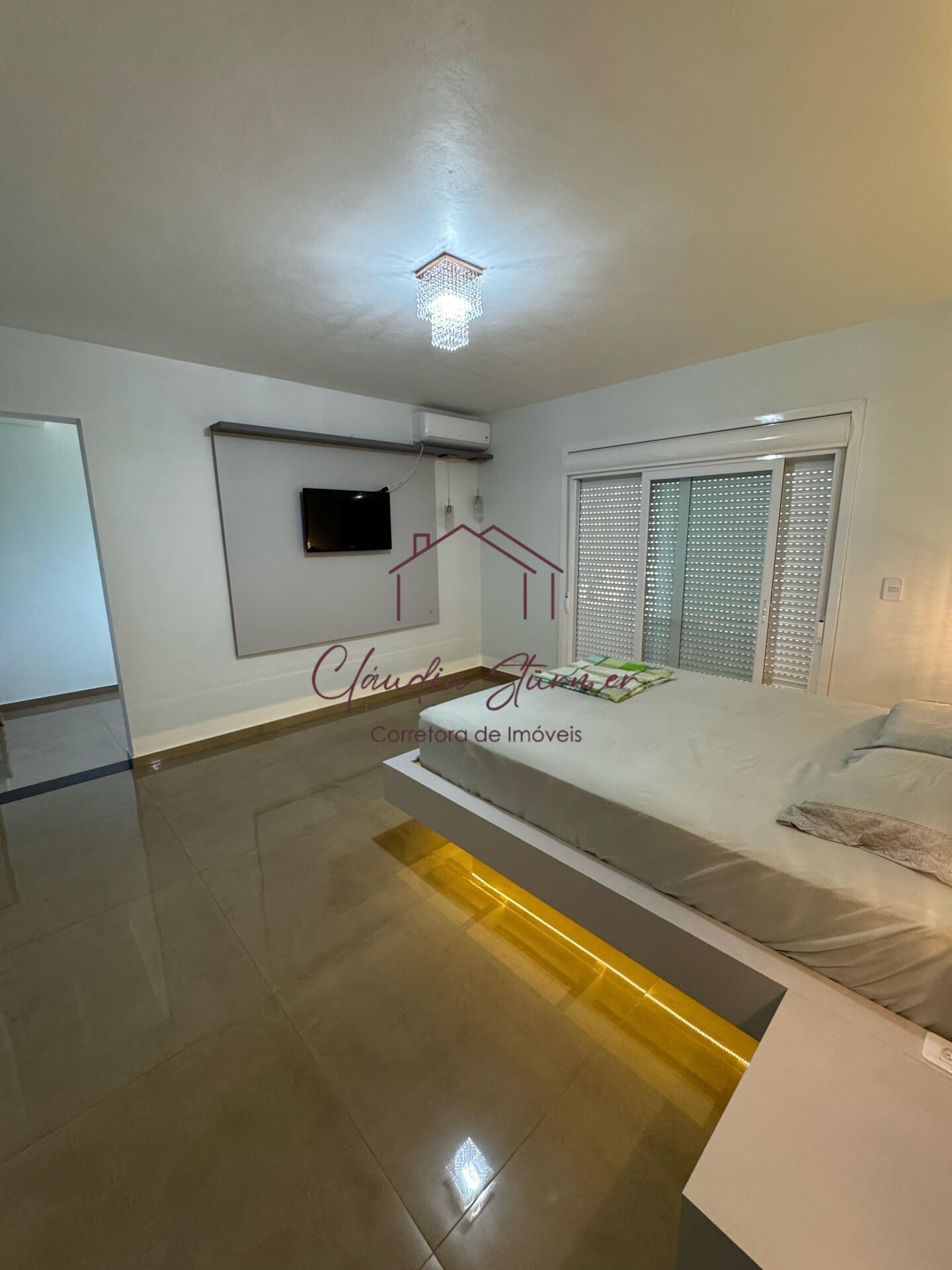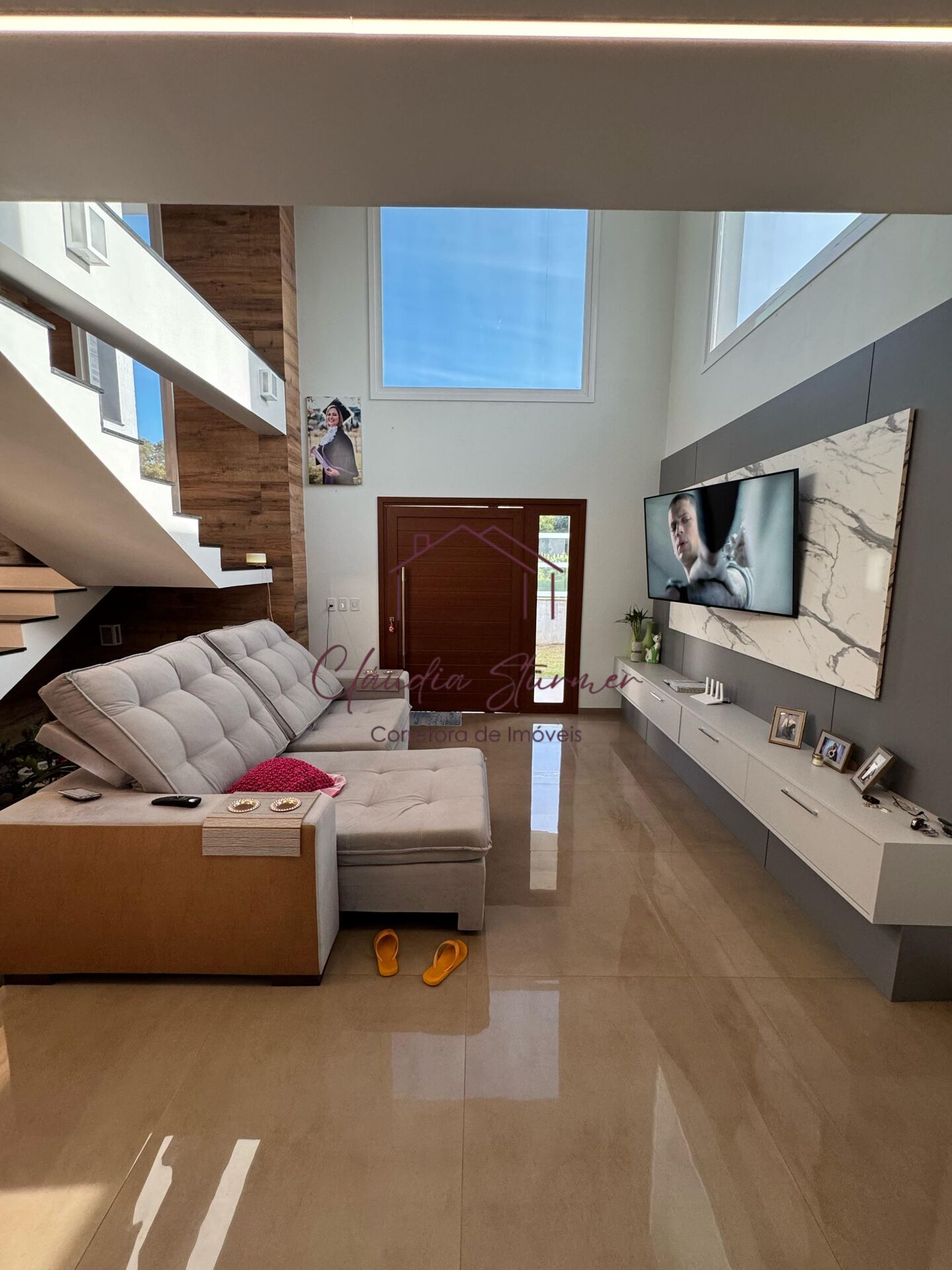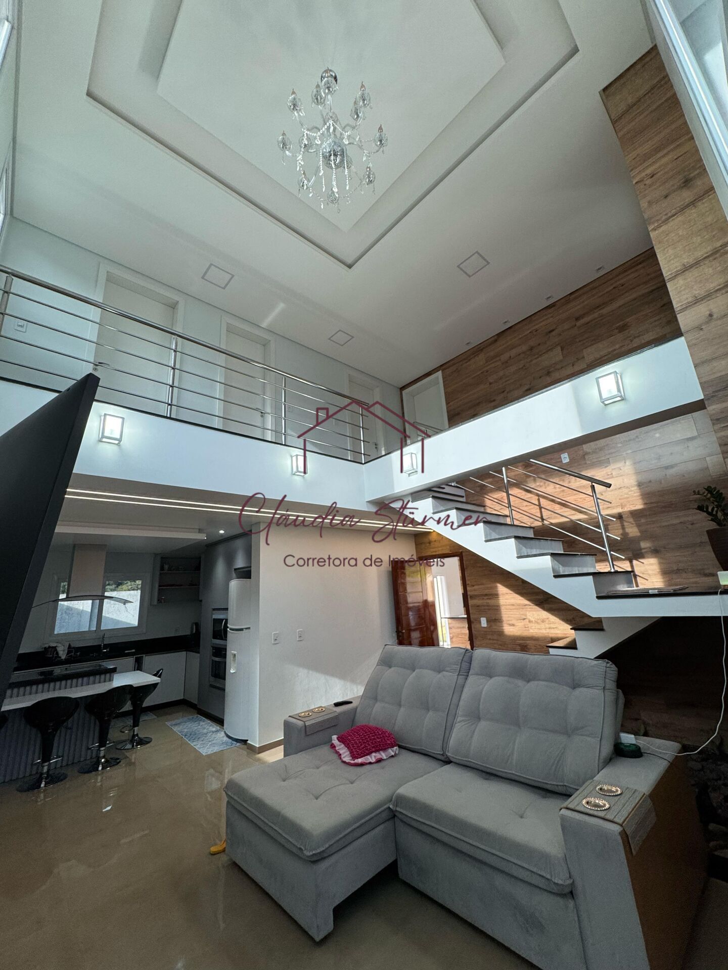 A casa conta com pé-direito alto, proporcionando imponência e sofisticação à sala de estar, valorizada por um belíssimo lustre e amplas janelas de vidro que garantem excelente iluminação natural e uma vista encantadora.