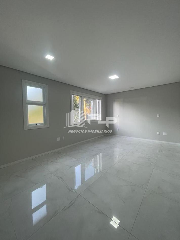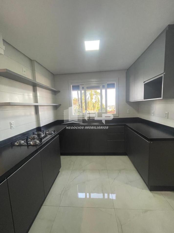 A área social integra sala de estar, jantar e cozinha em um ambiente amplo e contemporâneo, com churrasqueira, rebaixo em gesso com iluminação embutida e uma ampla janela piso ao teto, trazendo maior luminosidade e amplitude para o espaço.