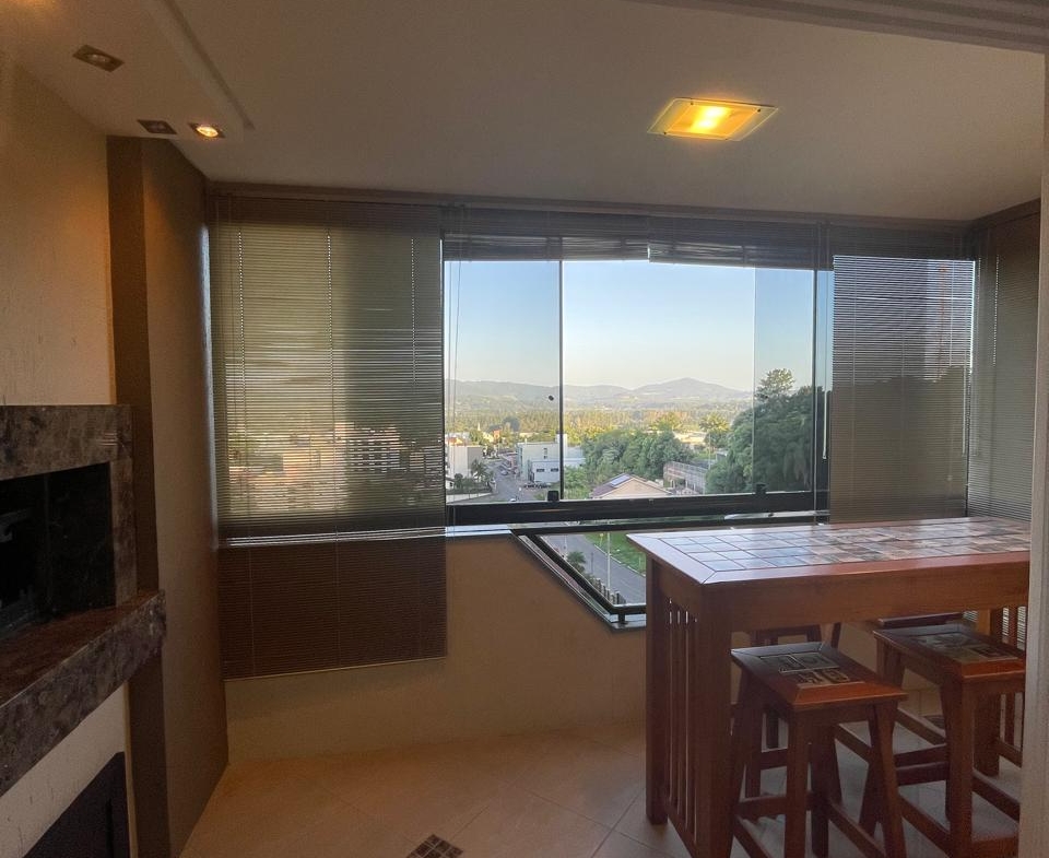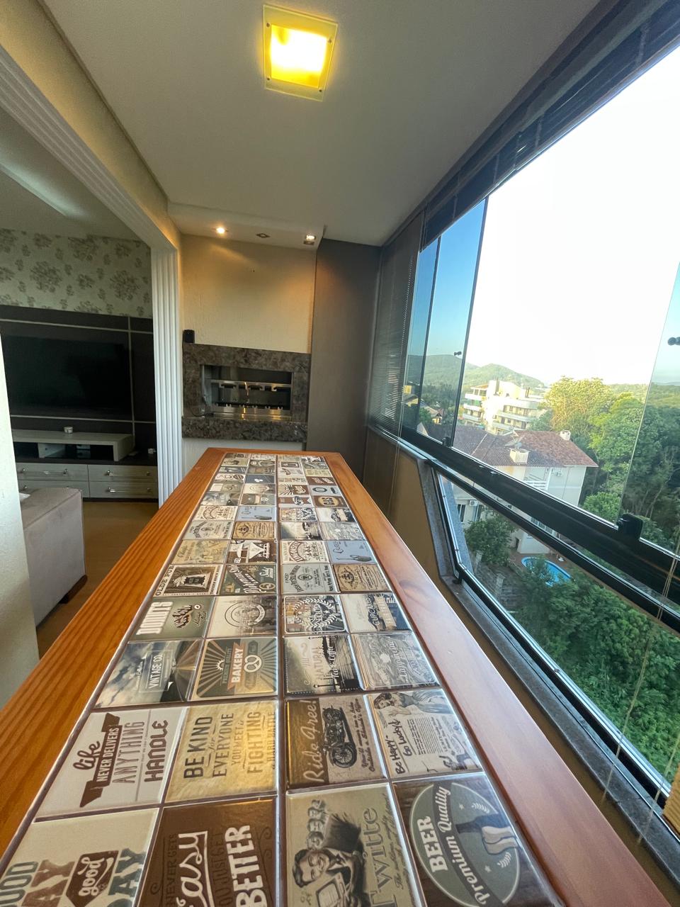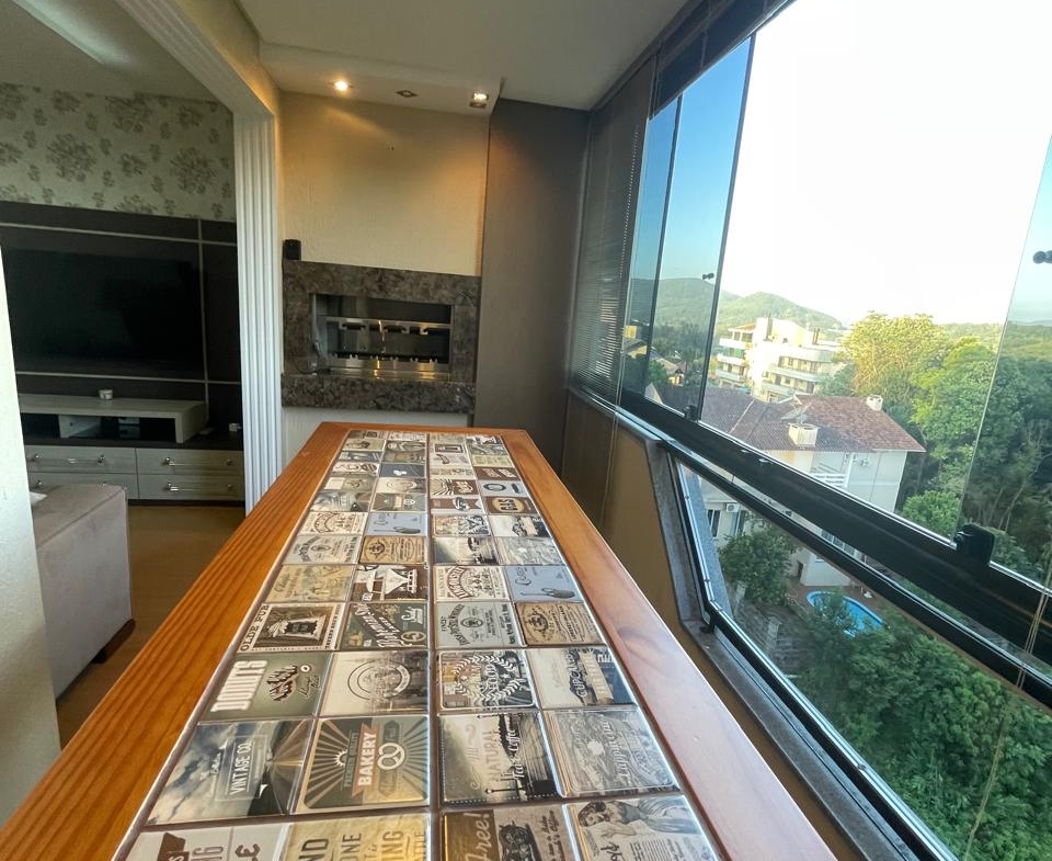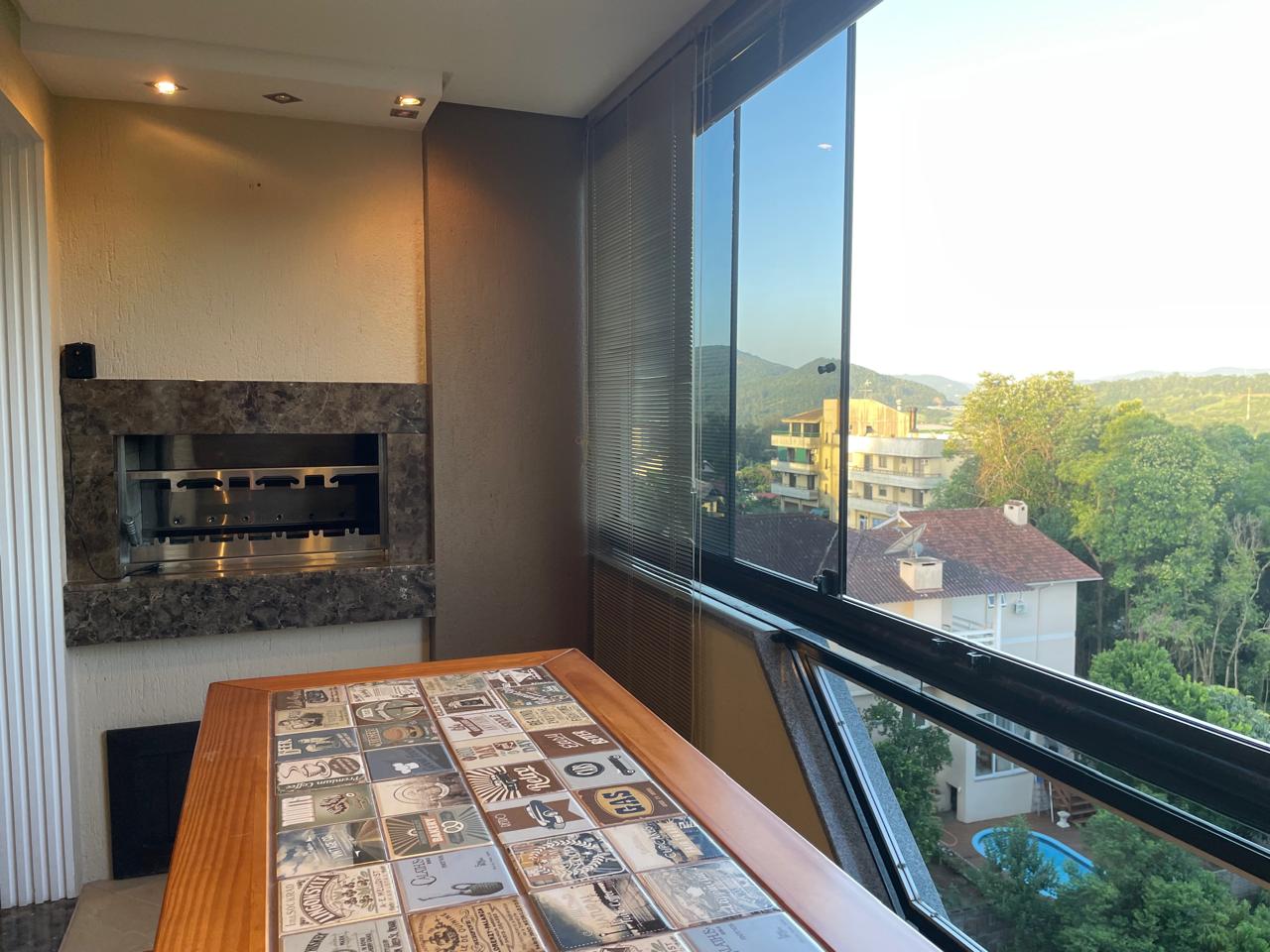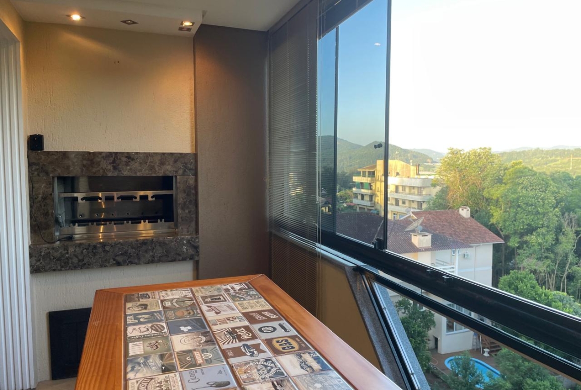 Uma charmosa sacada fechada com vidros, com espaço gourmet e churrasqueira .
