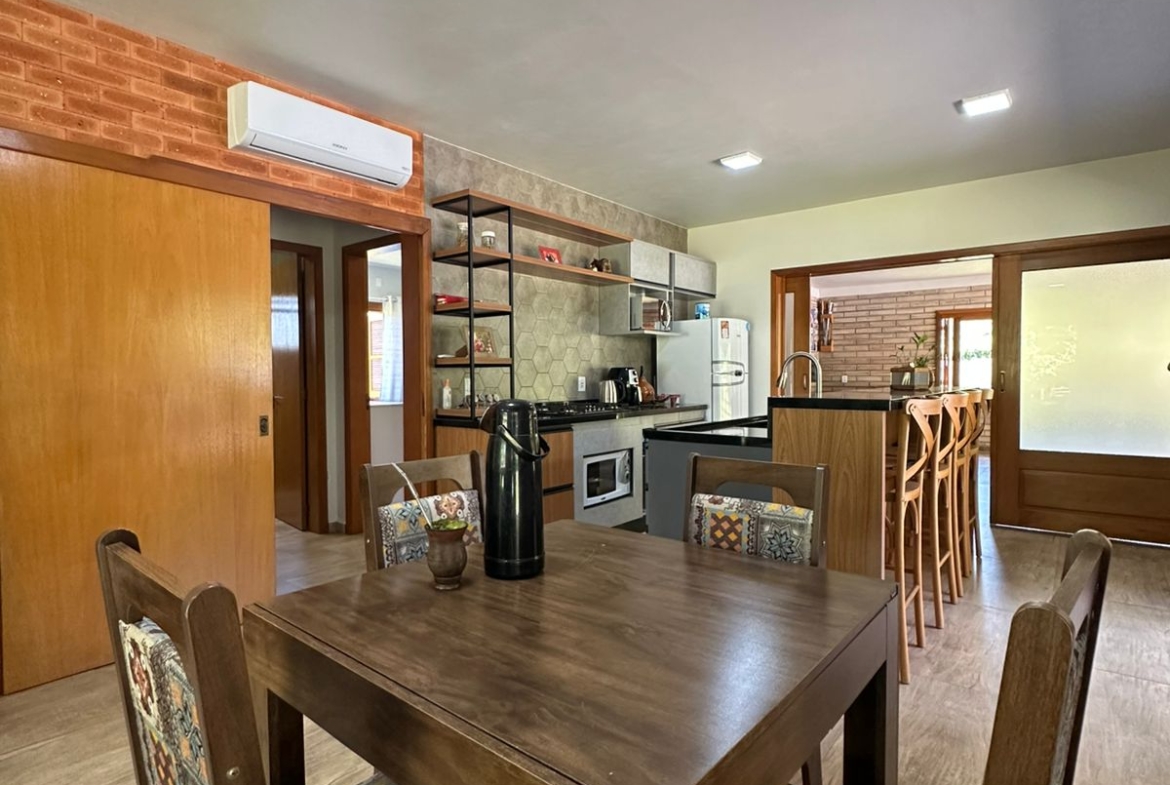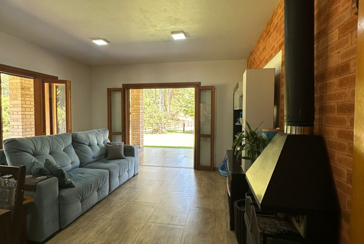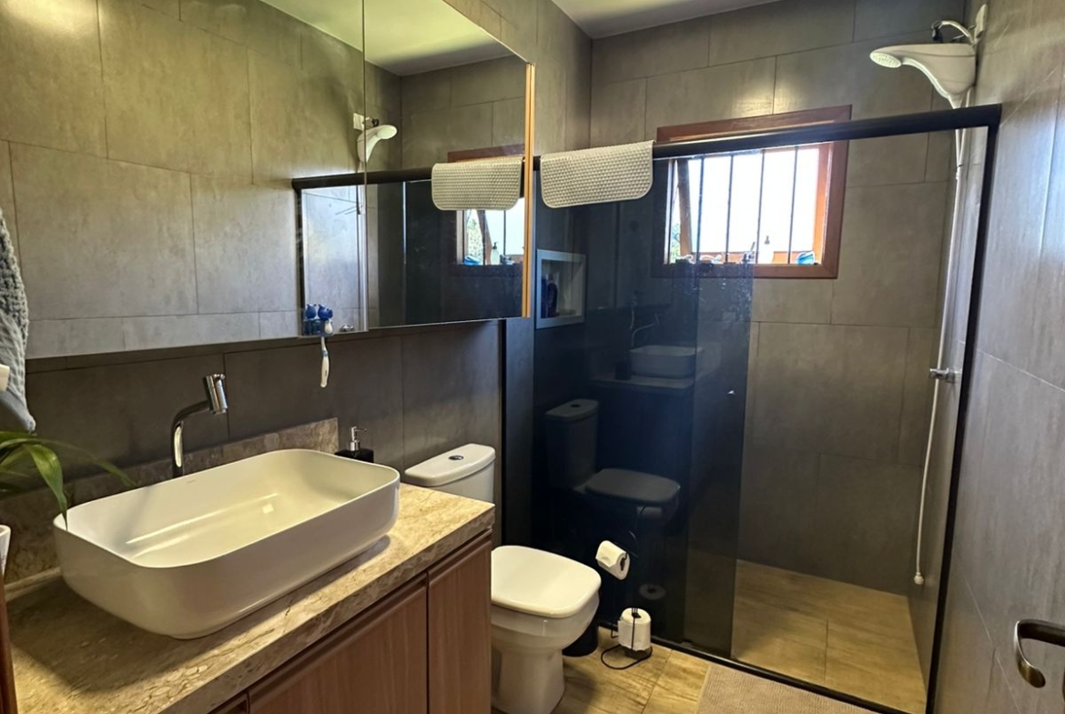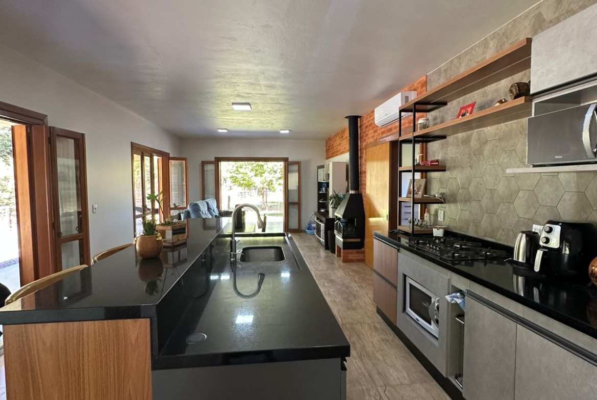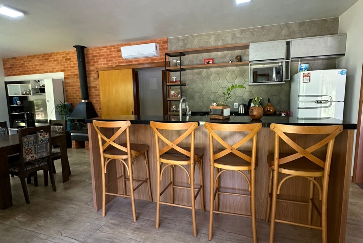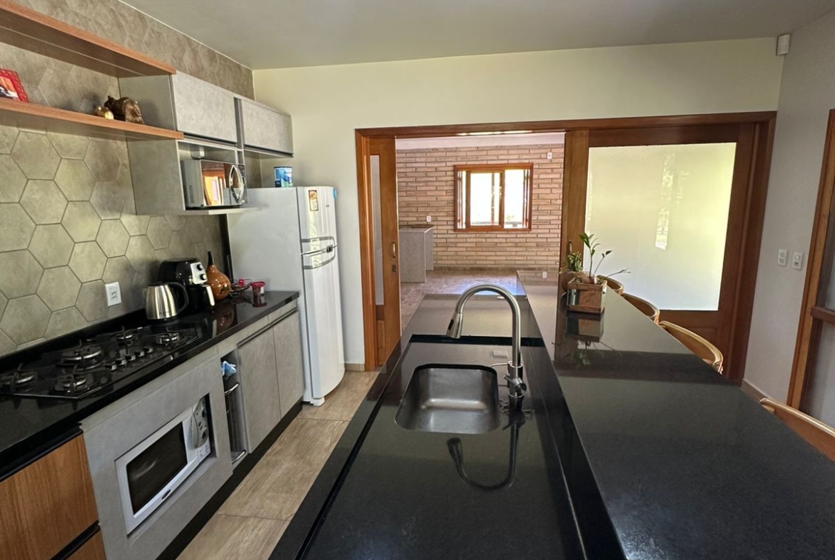 Casa toda em pedra gres, porcelanato, abertura de madeira alto padrão, cozinha/espaço gourmet e sala de estar jantar, 02 dormitórios( sendo 01 suíte) garagem para 02 carros, com churrasqueira, pia e lavabo. Área na extensão de praticamente toda casa, lindo jardim arborizado, com árvores frutíferas, galpãozinho e canil.