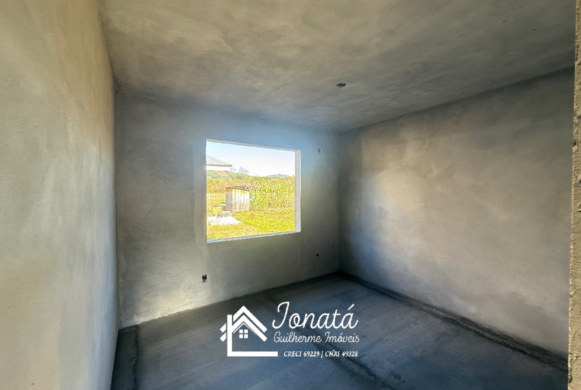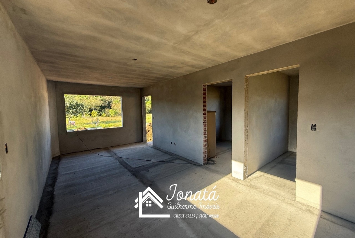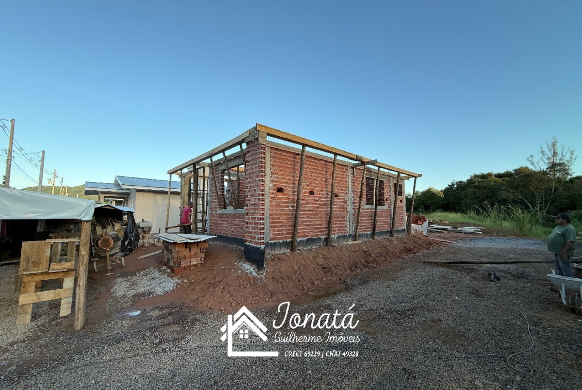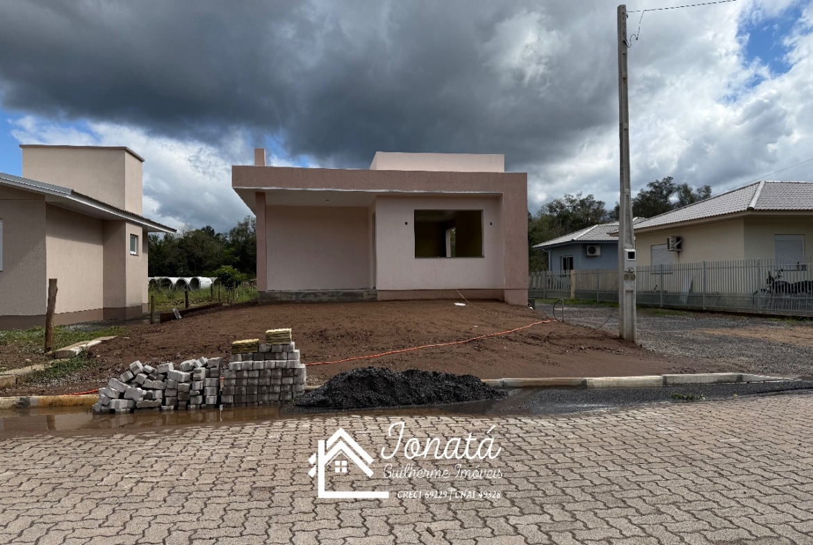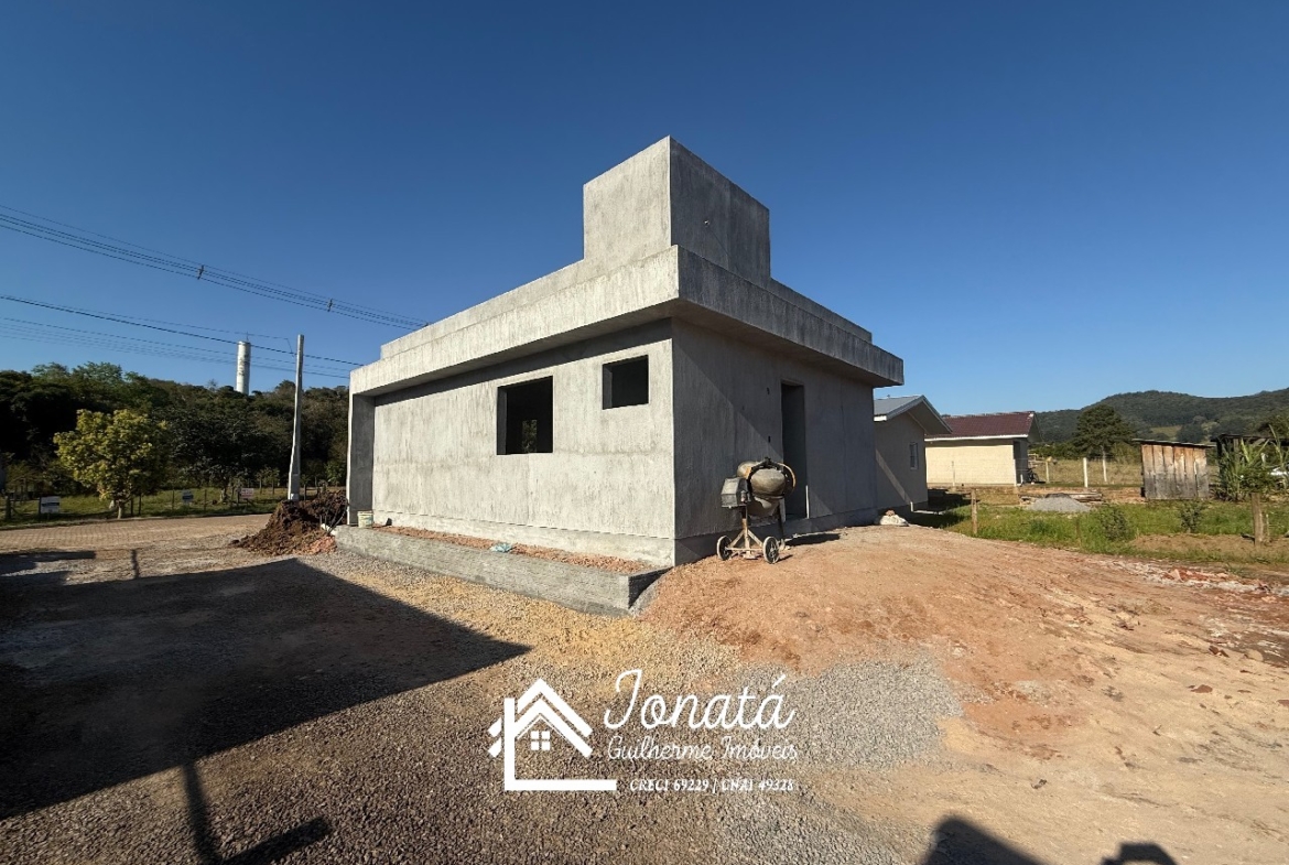 Casa com 2 dormitórios, banheiro social, sala e cozinha no conceito aberto, área de serviço e varanda na frontal.