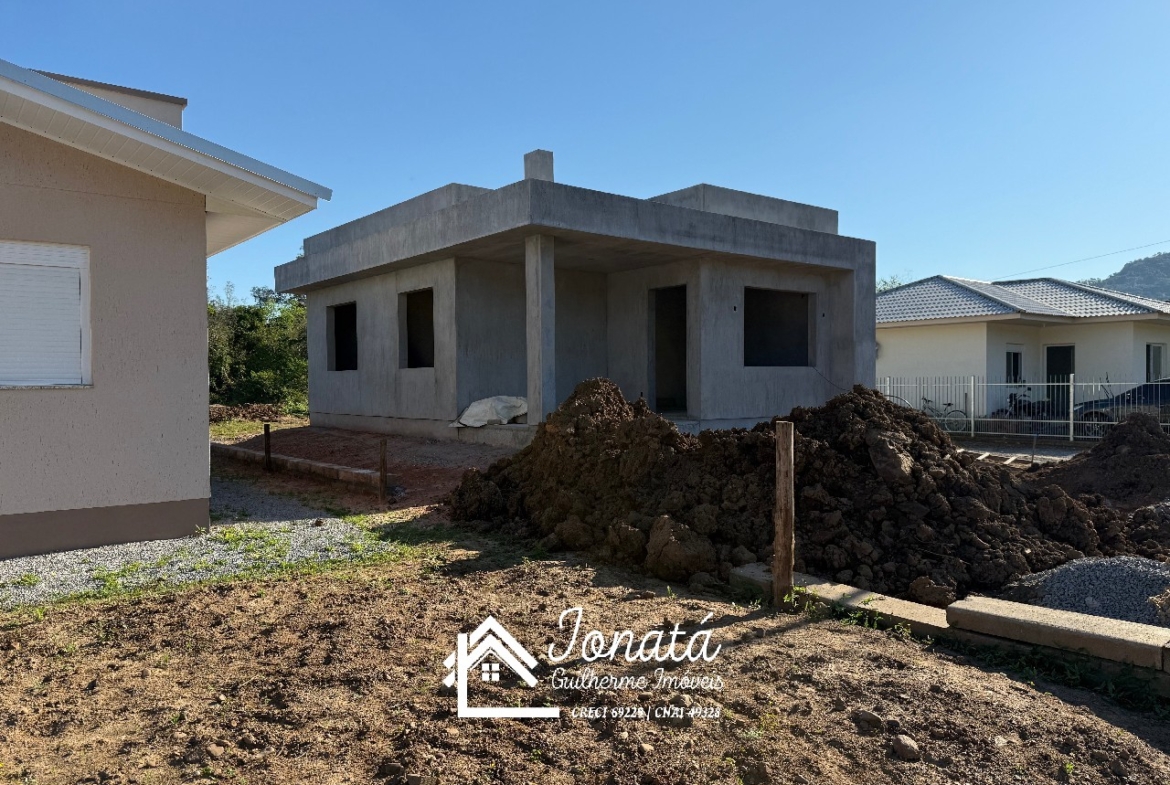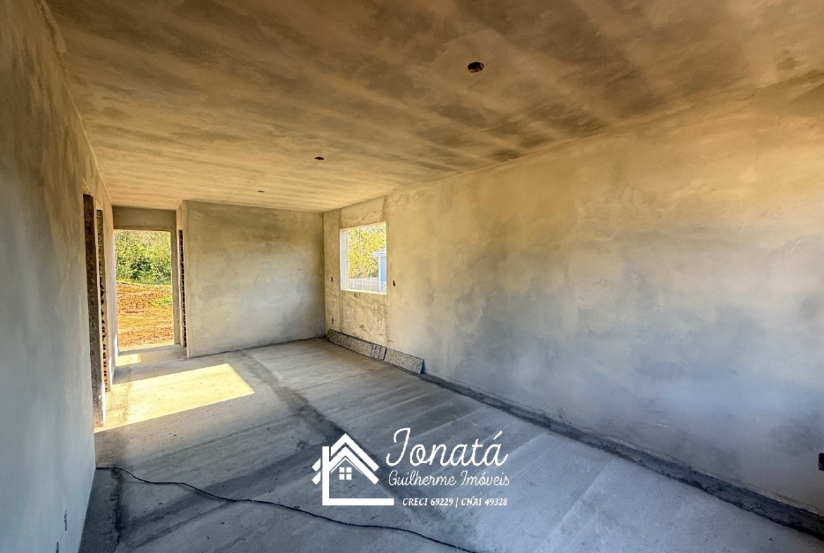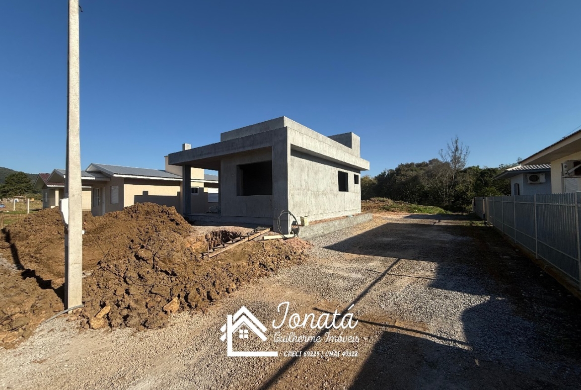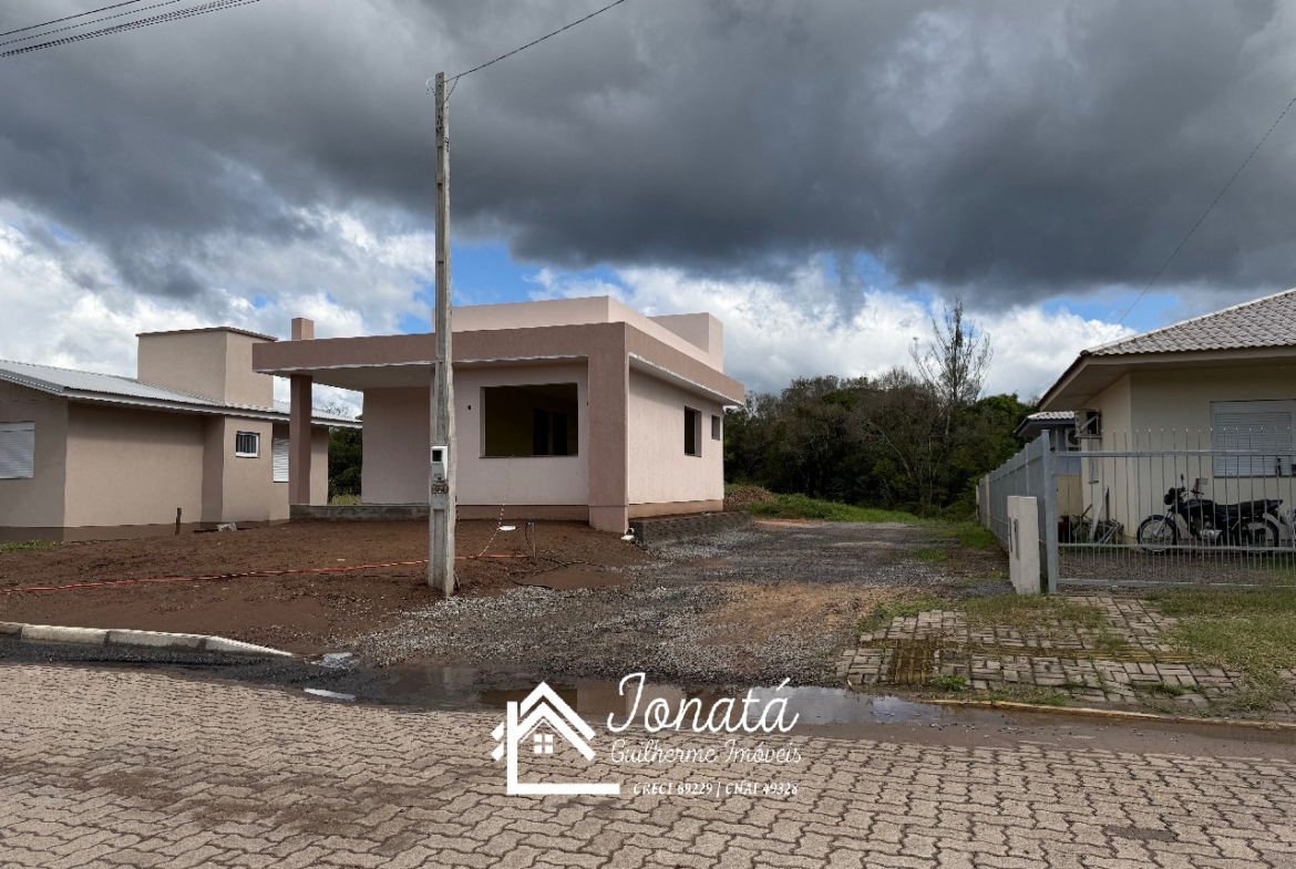 Casa com 2 dormitórios, banheiro social, sala e cozinha no conceito aberto, área de serviço e varanda na frontal.