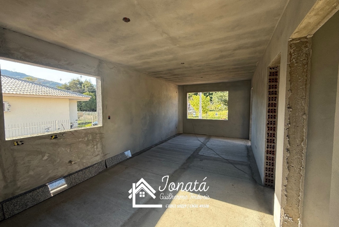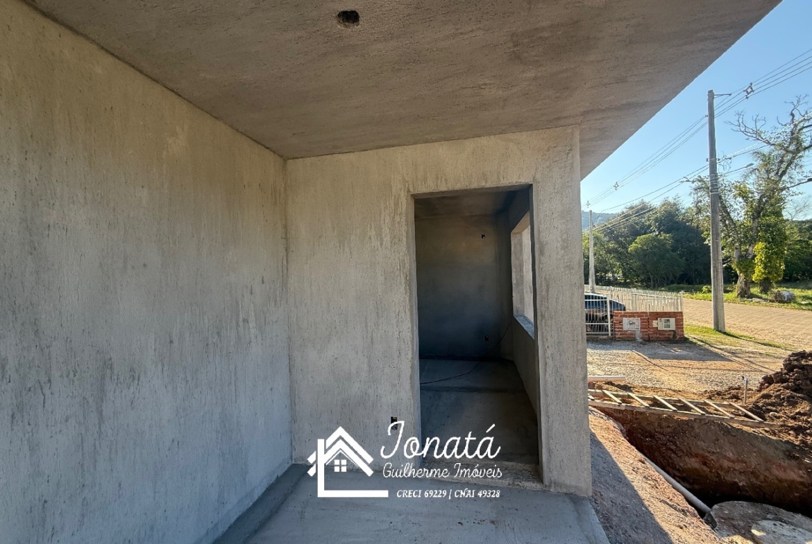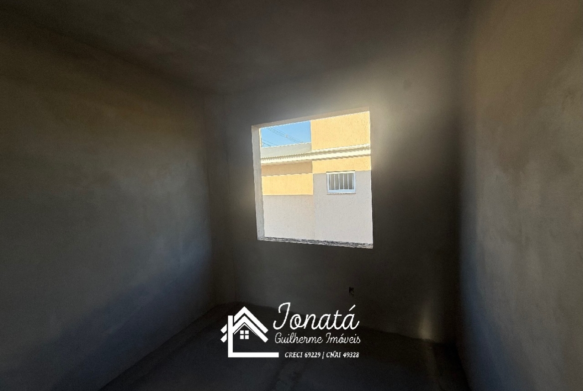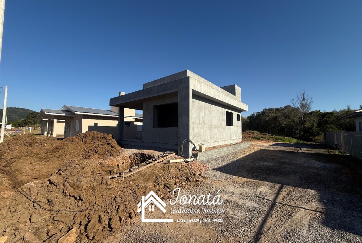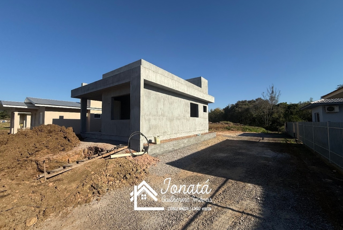 Casa com 2 dormitórios, banheiro social, sala e cozinha no conceito aberto, área de serviço e varanda na frontal.