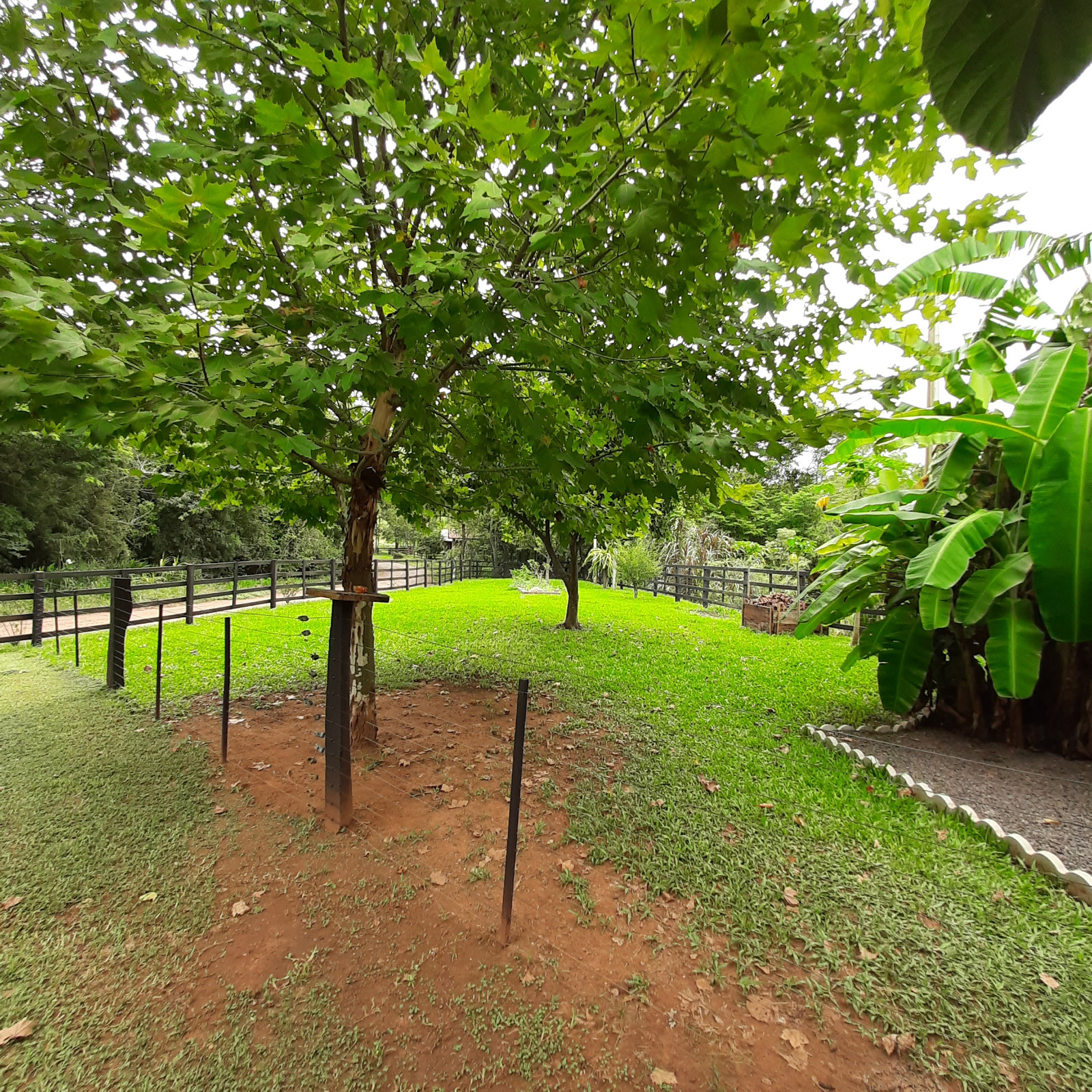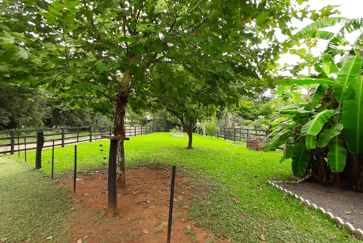 A varanda faz a conexão do interior da casa com o pátio que é todo cercado.