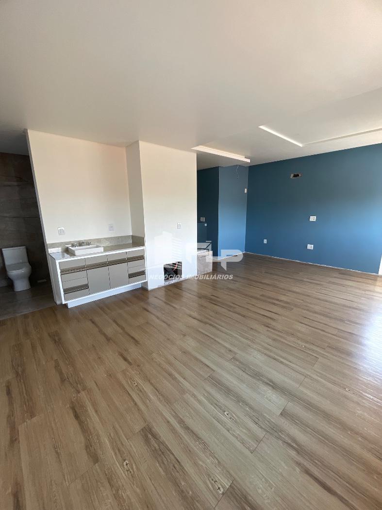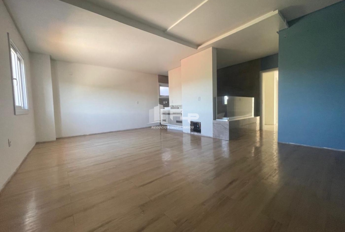 A área social integrada é um grande destaque: sala de estar e jantar com lareira a gás, cozinha e uma varanda que revela uma linda vista para o Centro da cidade. E graças ao janelão envidraçado, essa mesma vista pode ser apreciada inclusive de dentro da sala, trazendo luz natural e uma sensação de amplitude.