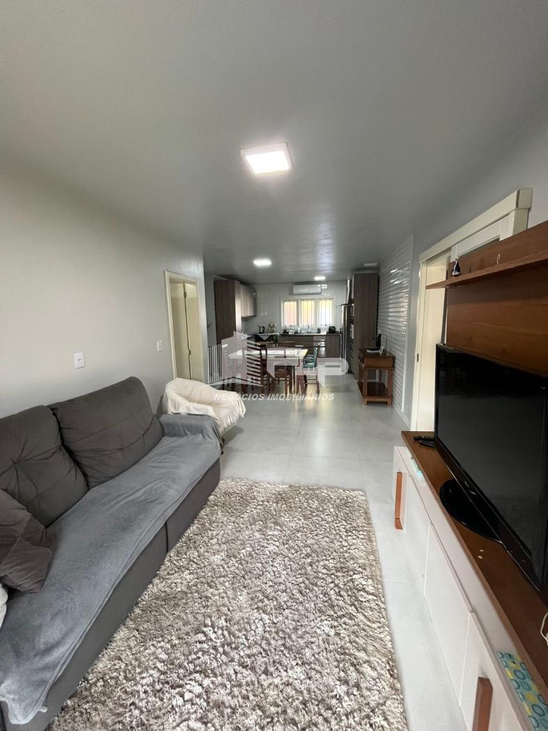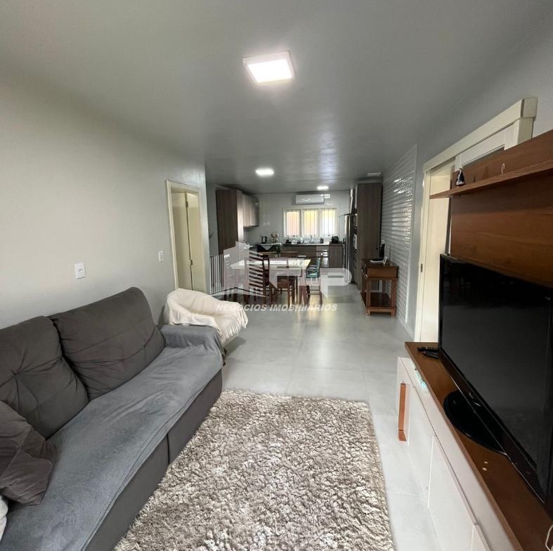 A casa conta com ambientes integrados na área social, unindo sala de estar e cozinha de forma prática e funcional. Uma das paredes é revestida, trazendo charme ao espaço.