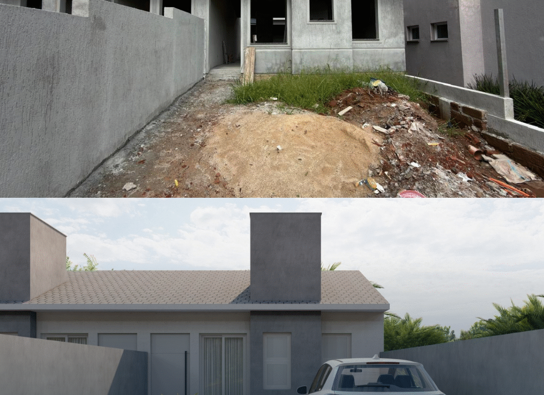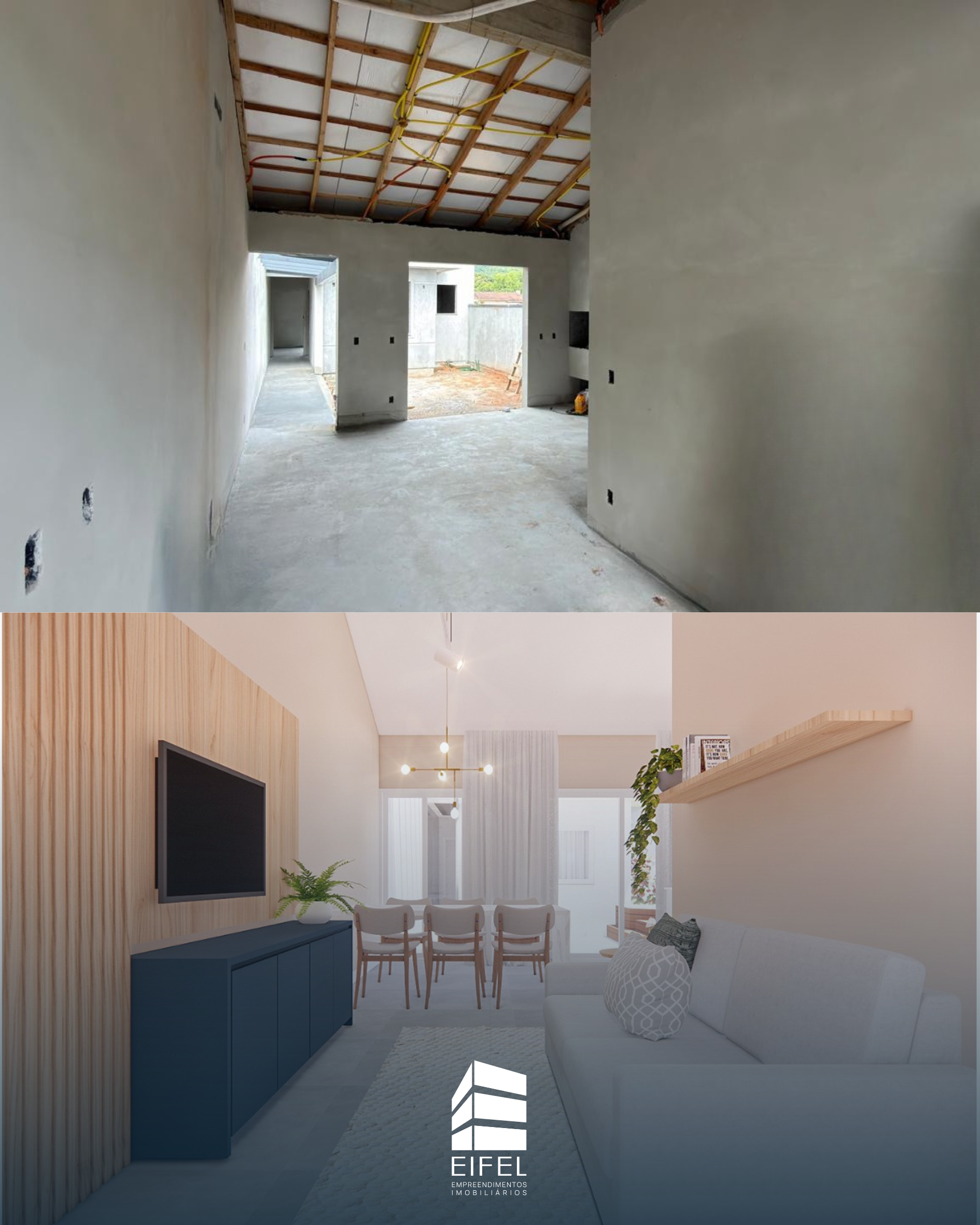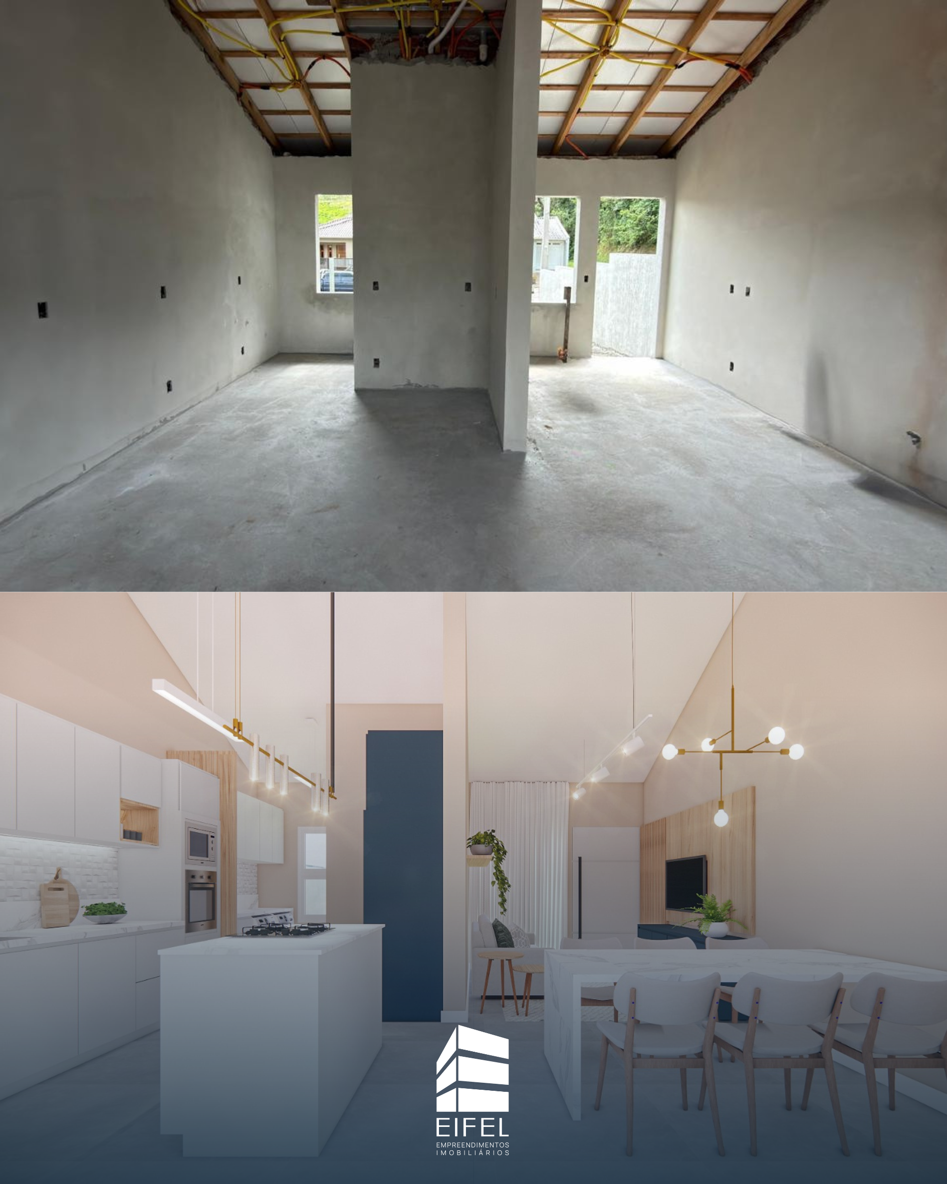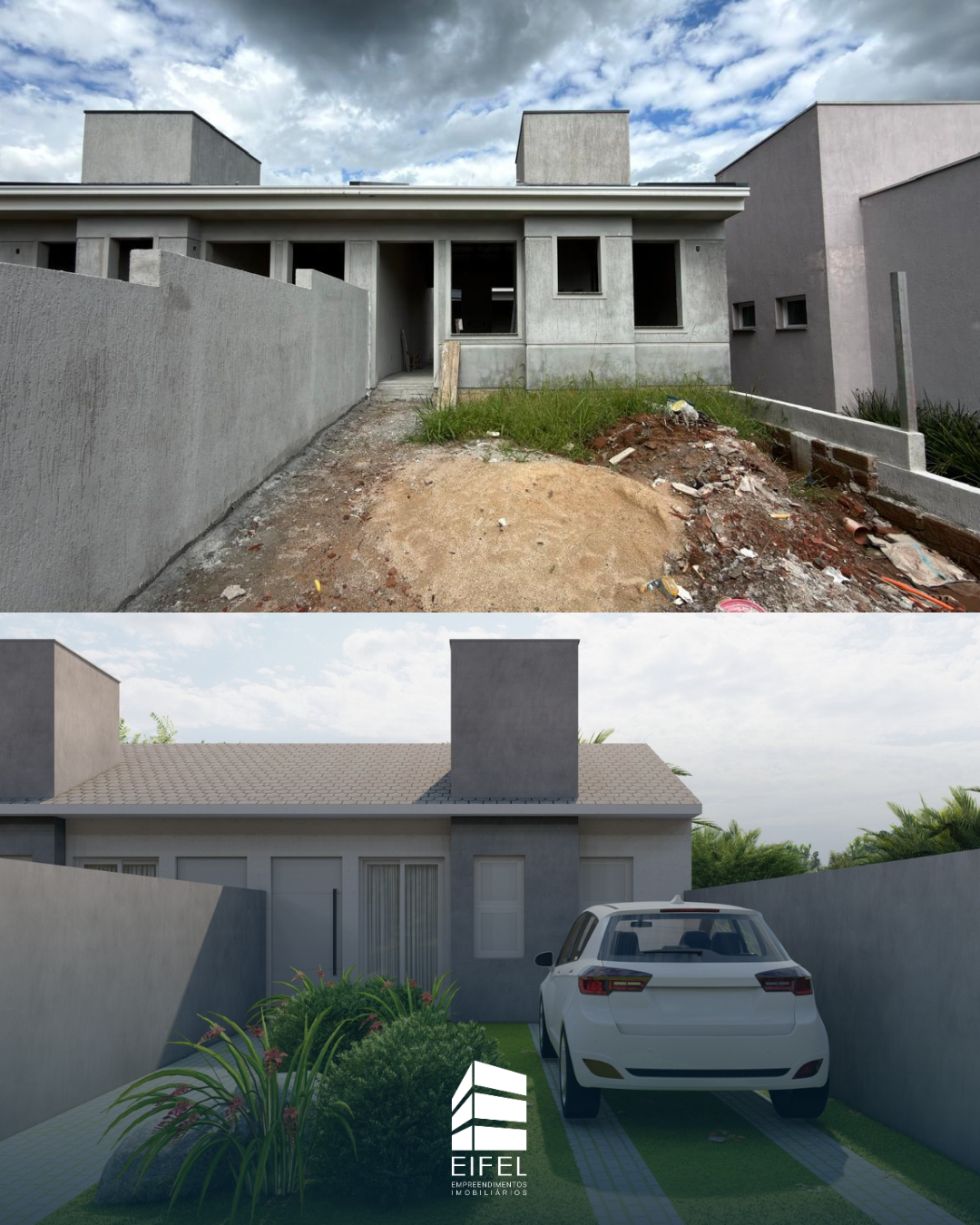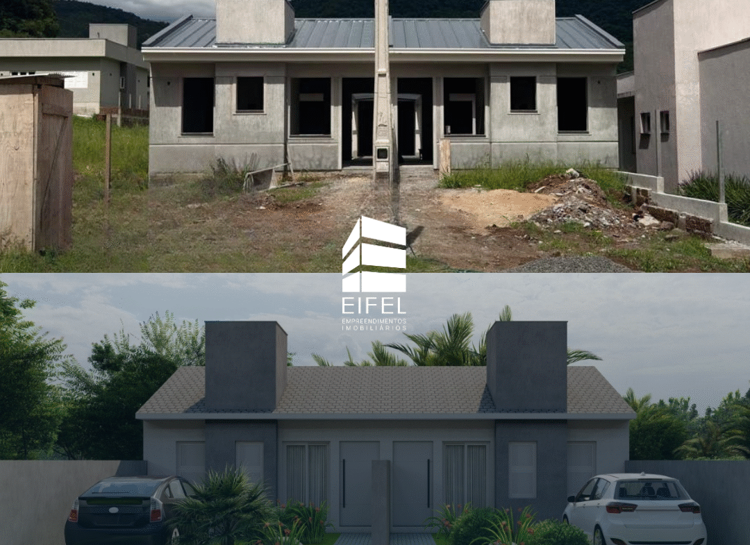 São duas casas, possuem a distribuição em: sala de estar e jantar integradas com cozinha, lavanderia, e lavabo. Jardim interno com espaço para ofurô, e aos fundos, duas suítes.