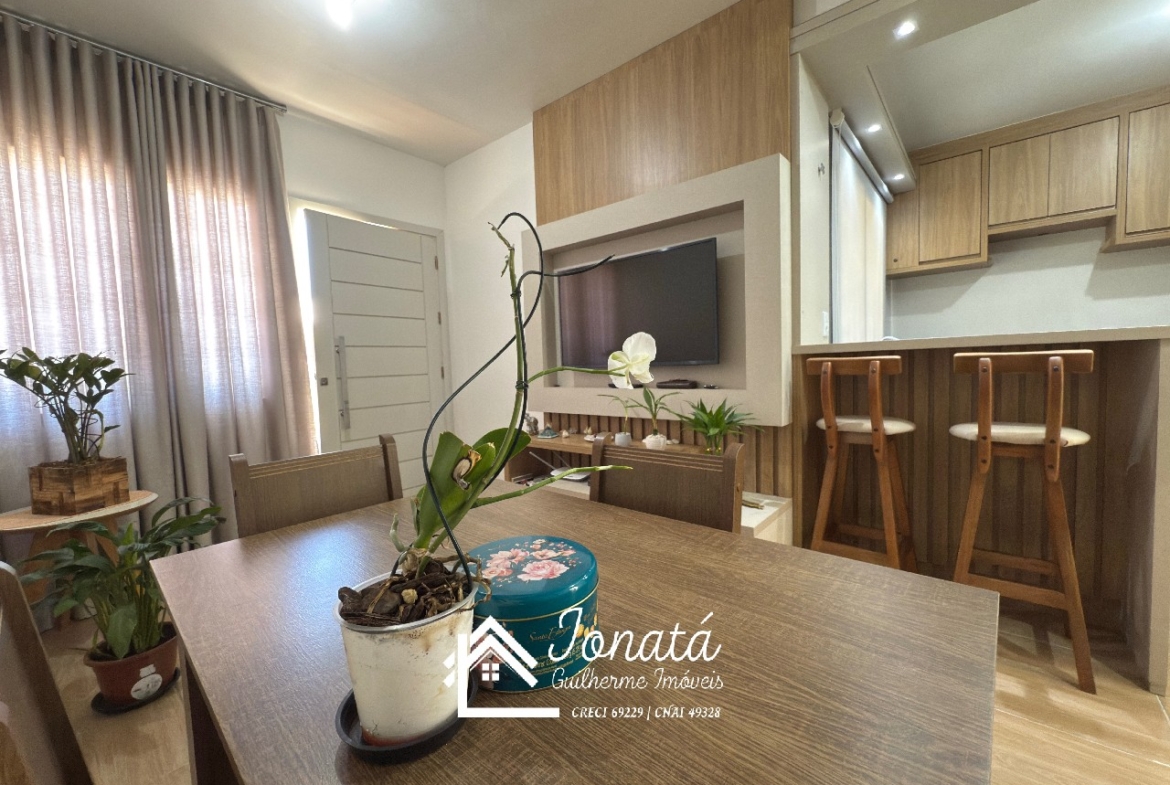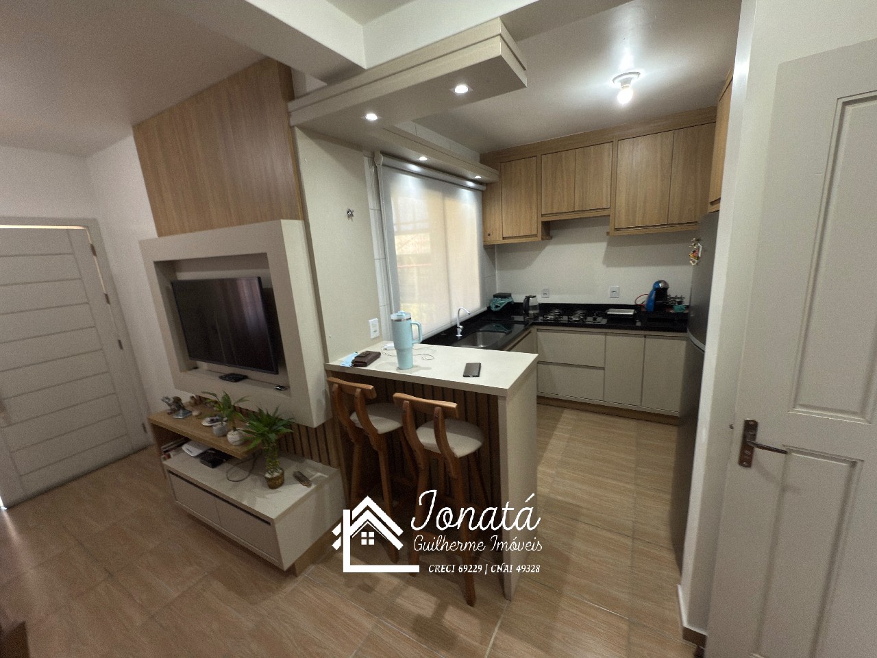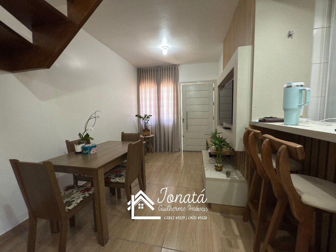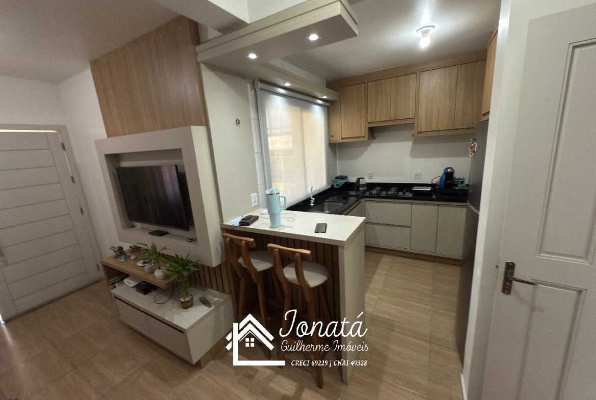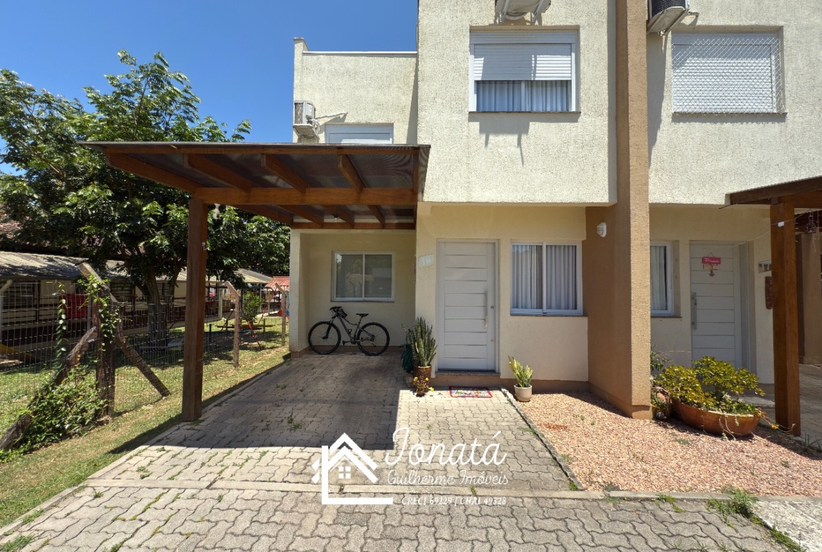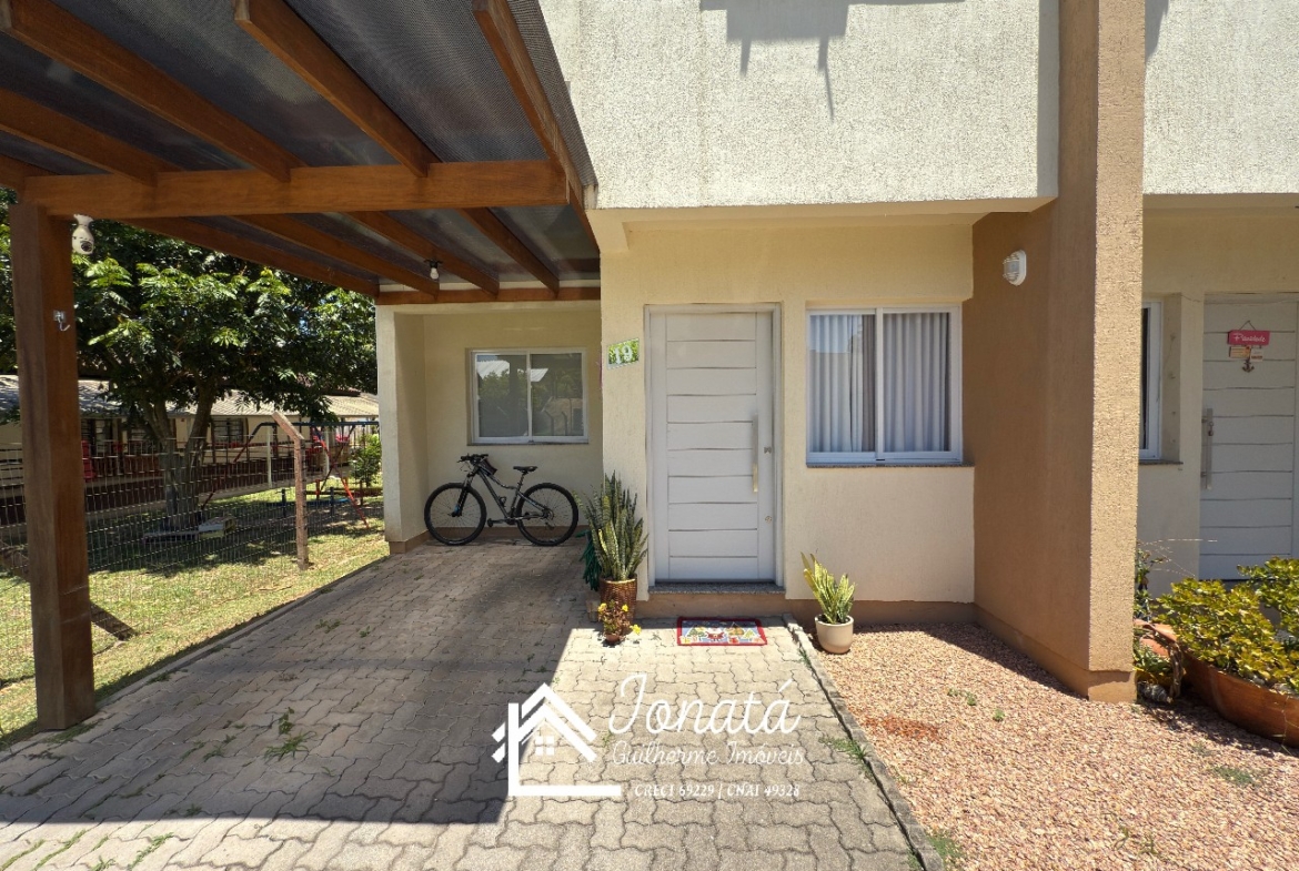 Sobrado com 54 m², distribuídos entre 2 dormitórios e banheiro no piso superior, cozinha e sala conceito aberto, área de serviço com churrasqueira, área coberta com vidro aos fundos, box de garagem coberta com pergolado.