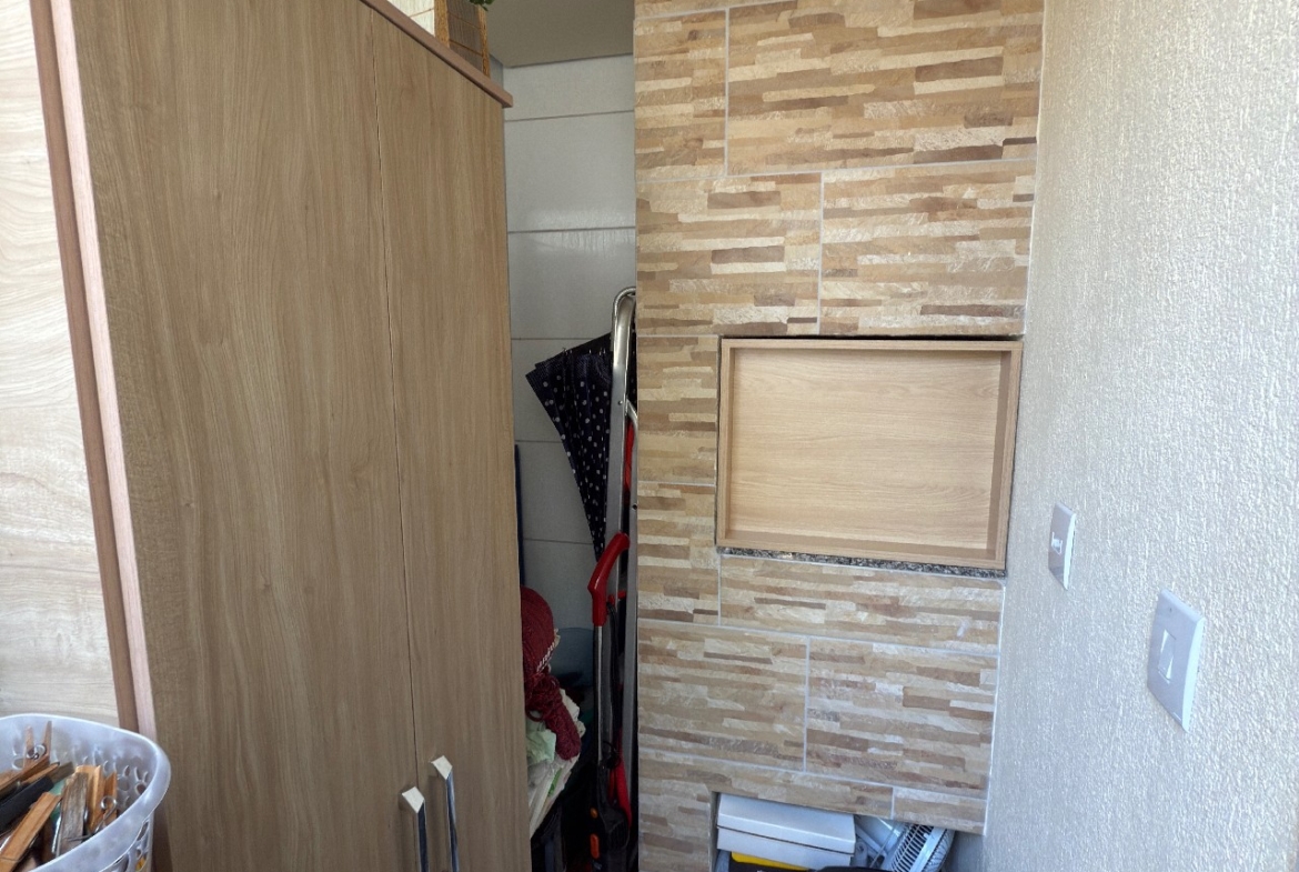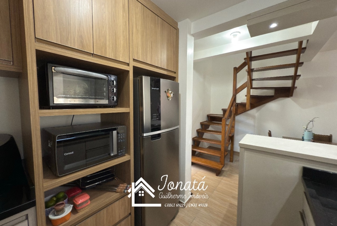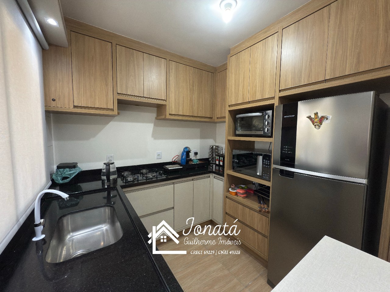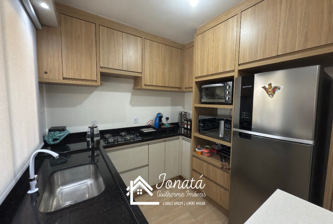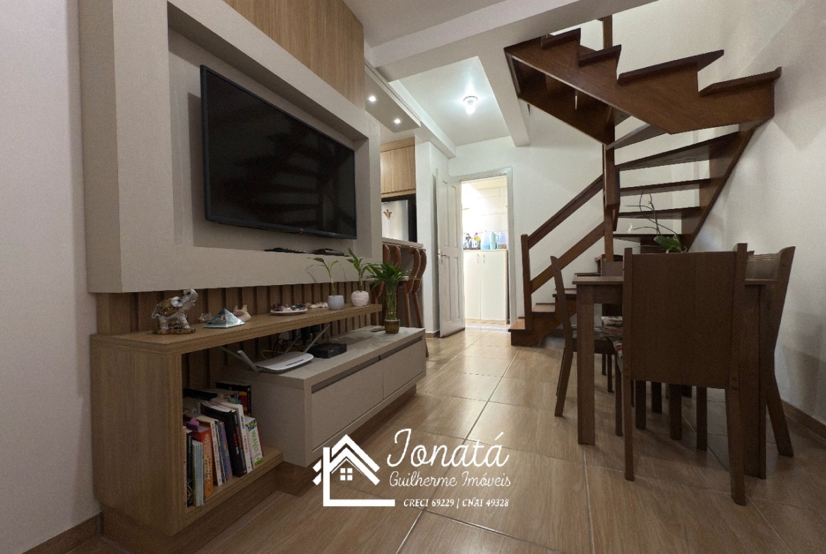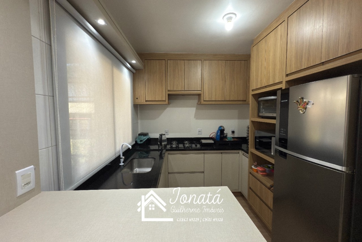 Sobrado com 54 m², distribuídos entre 2 dormitórios e banheiro no piso superior, cozinha e sala conceito aberto, área de serviço com churrasqueira, área coberta com vidro aos fundos, box de garagem coberta com pergolado.