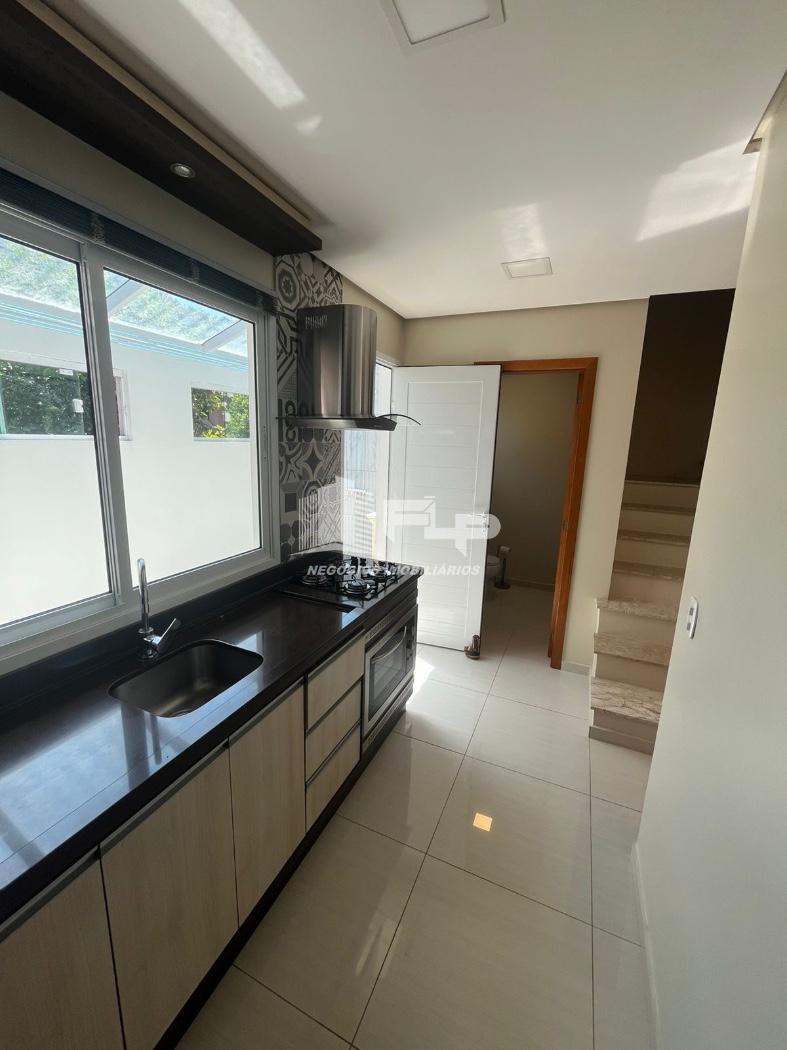 No térreo, a sala de estar e jantar integradas se conectam à cozinha, com móveis sob medida, equipada com bancada de granito marrom e coifa, trazendo um charme a mais.