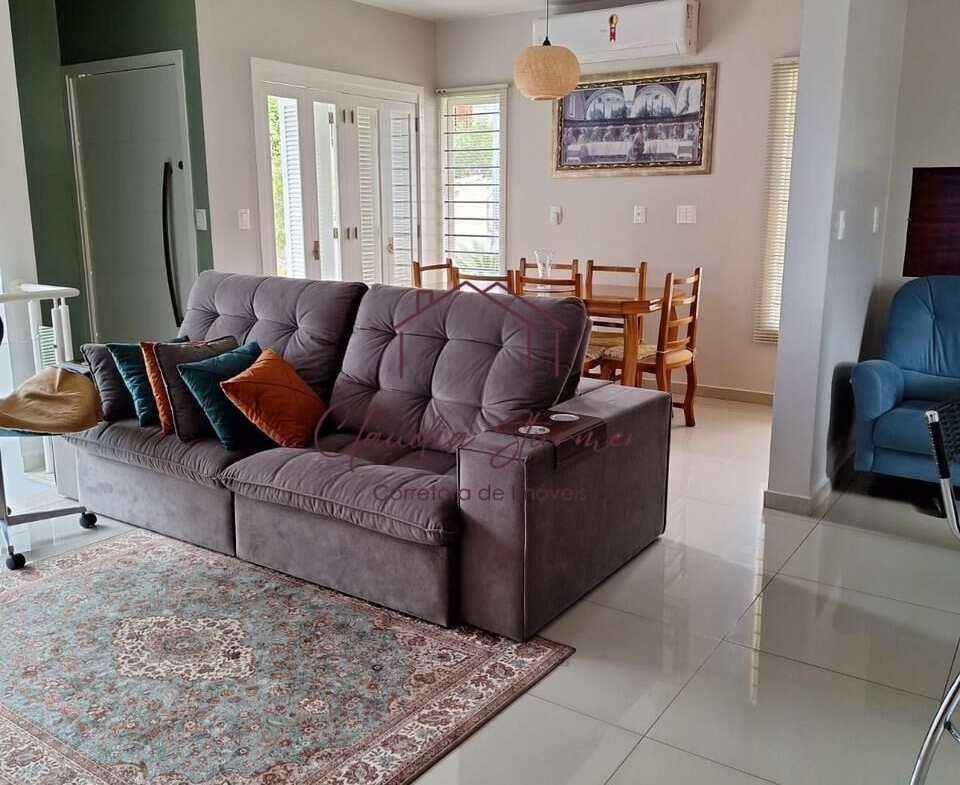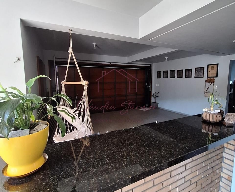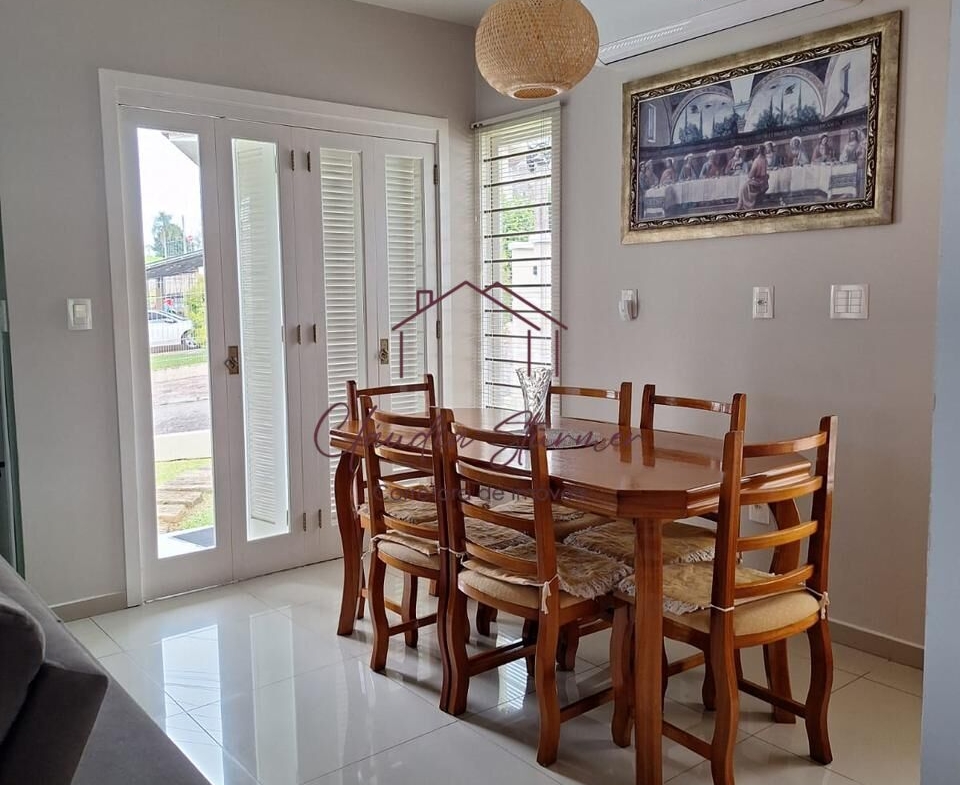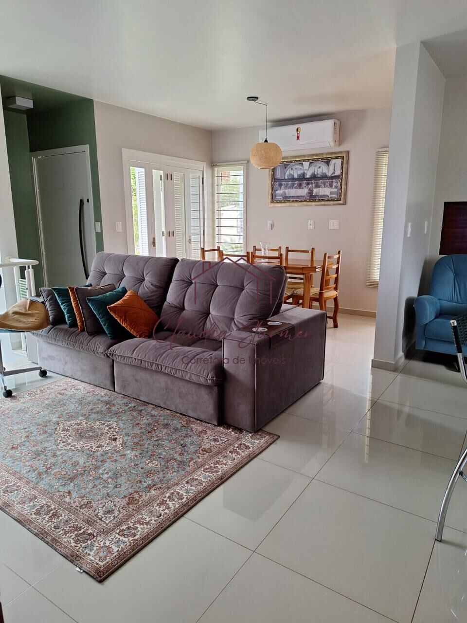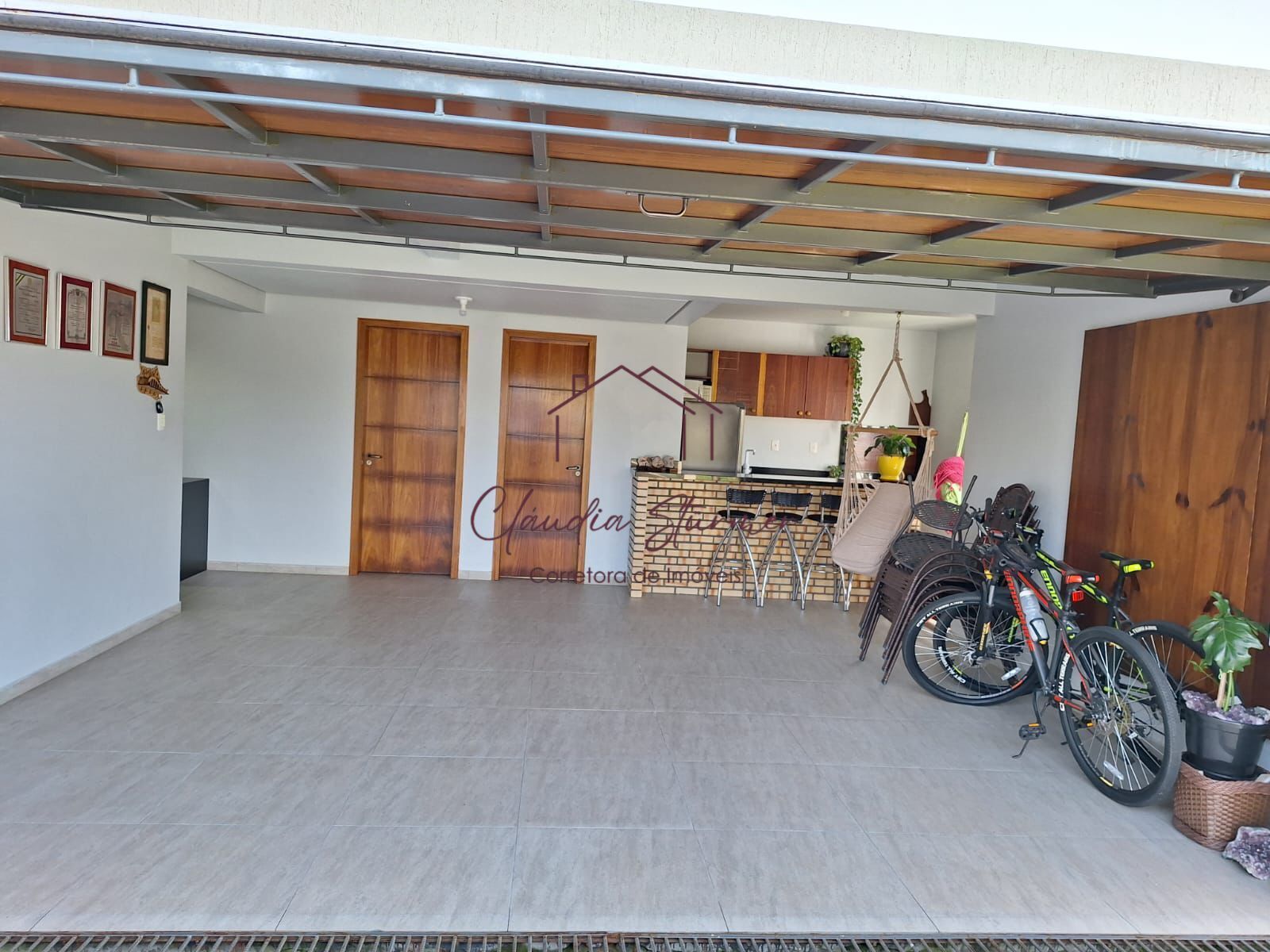 Possui 3 dormitórios, sendo 1 suíte, 3 banheiros, ampla sala de estar integrada à sala de jantar e cozinha, lavanderia no andar inferior, cozinha auxiliar e garagem fechada para 2 veículos.